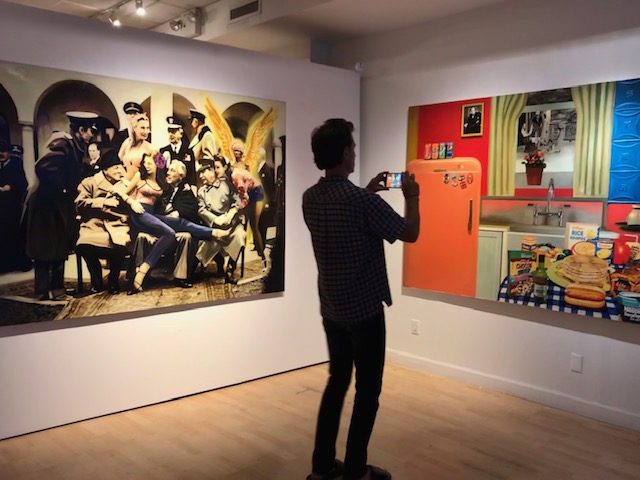 The artist implies that our collective experience is dynamic and manifests a visual space determined by memory shifts and cultural analogies. In a broad sense she depicts a world where unrelated events can begin to co-exist simultaneously. This often creates a comical effect which allows for an ironic political commentary.
